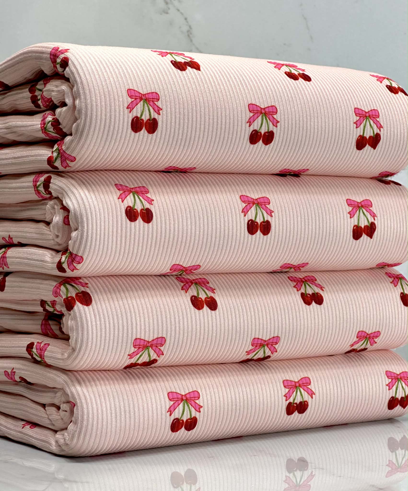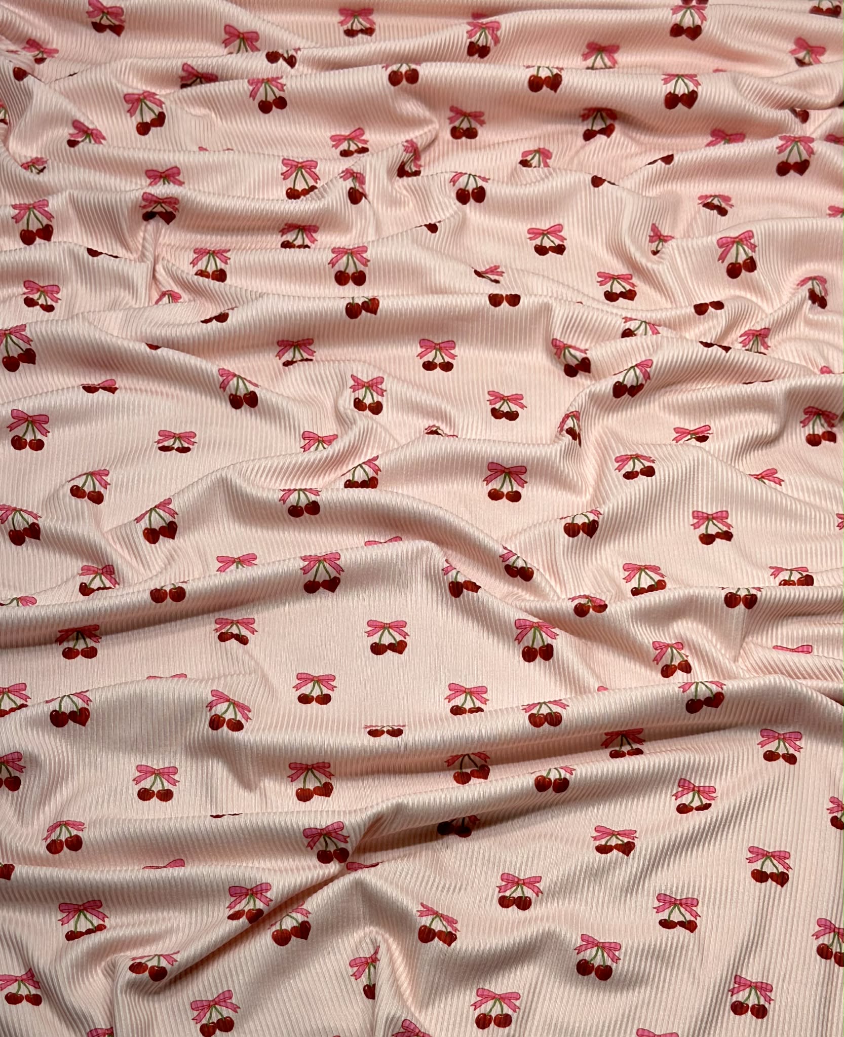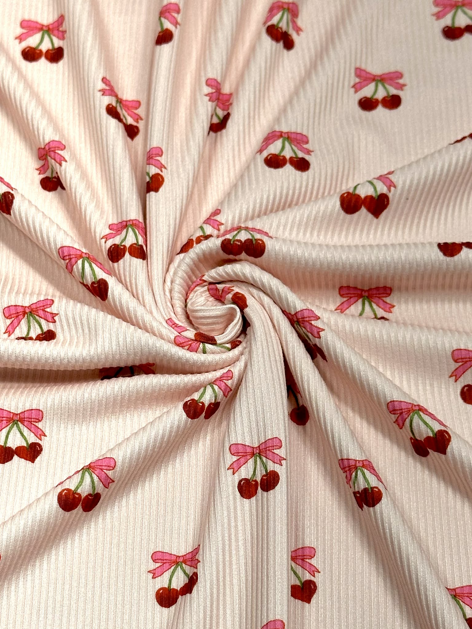 (2X2 BRUSHED RIB) CHERRY HEART WITH BOWS ON BLUSH