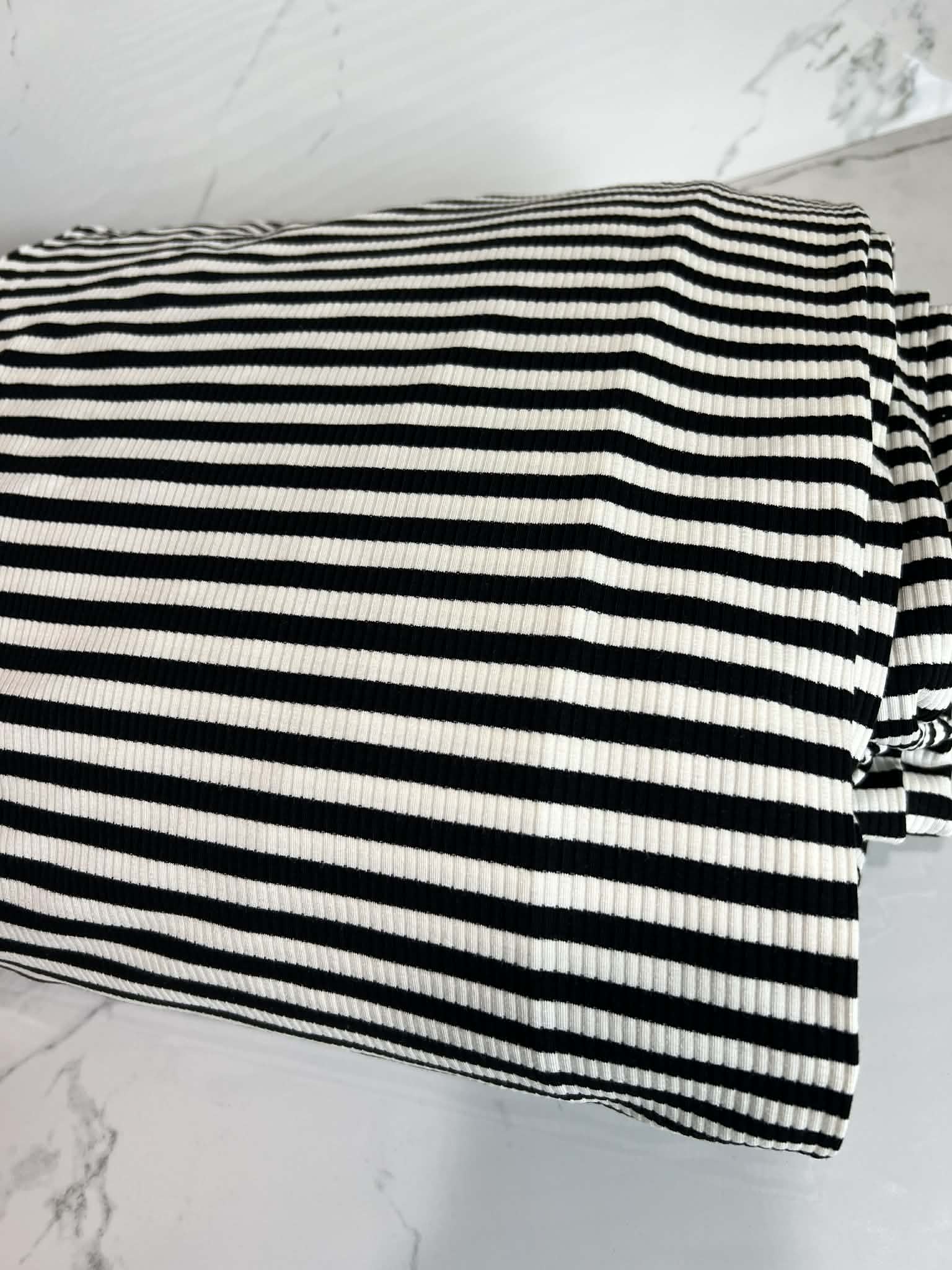 (RAYON/SPANDEX RIB) BLACK AND OFF WHITE STRIPES ( 8 CONTIUOUS YARDS)