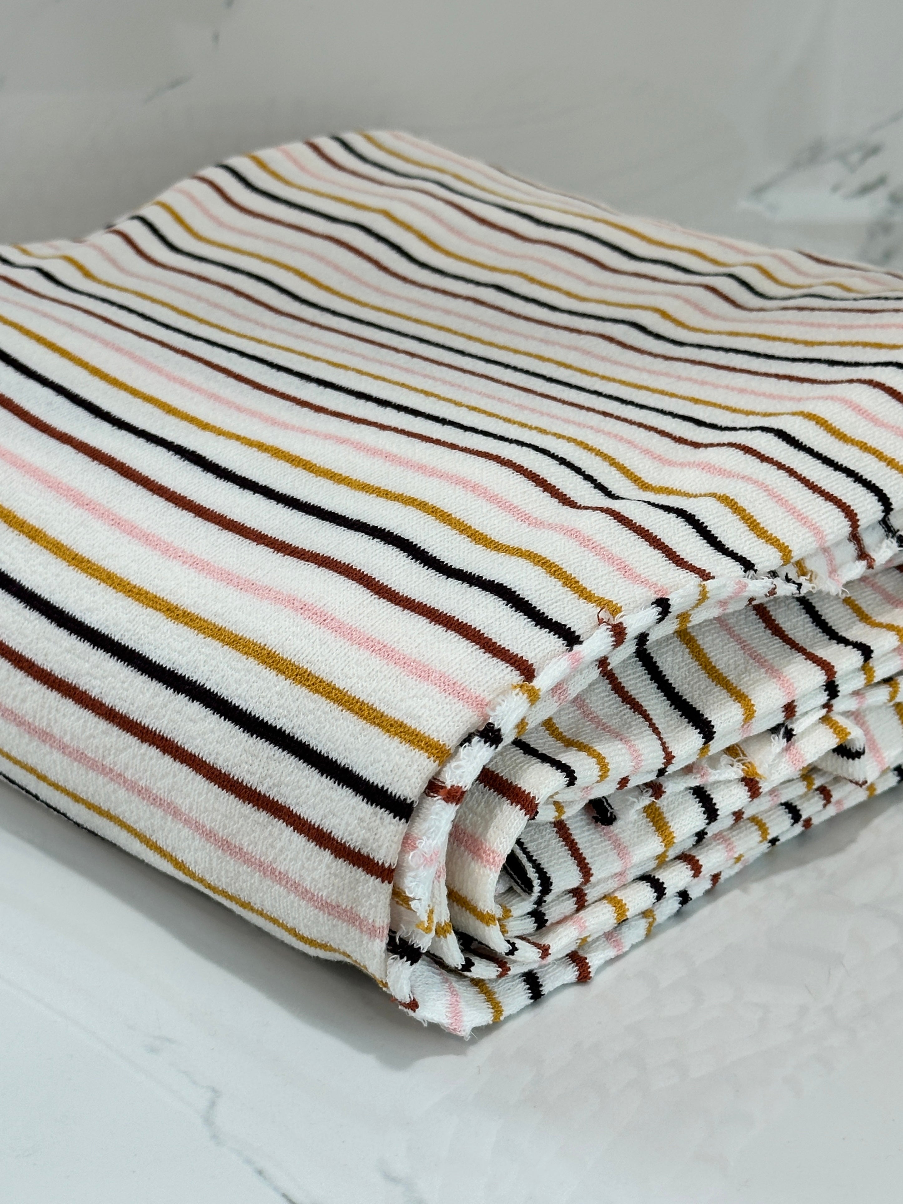 (SWEATER HACCI) RUST, VIOLET, MUSTARD, AND PINK STRIPES ON OFF WHITE (5 CONTIUOUS YARDS)