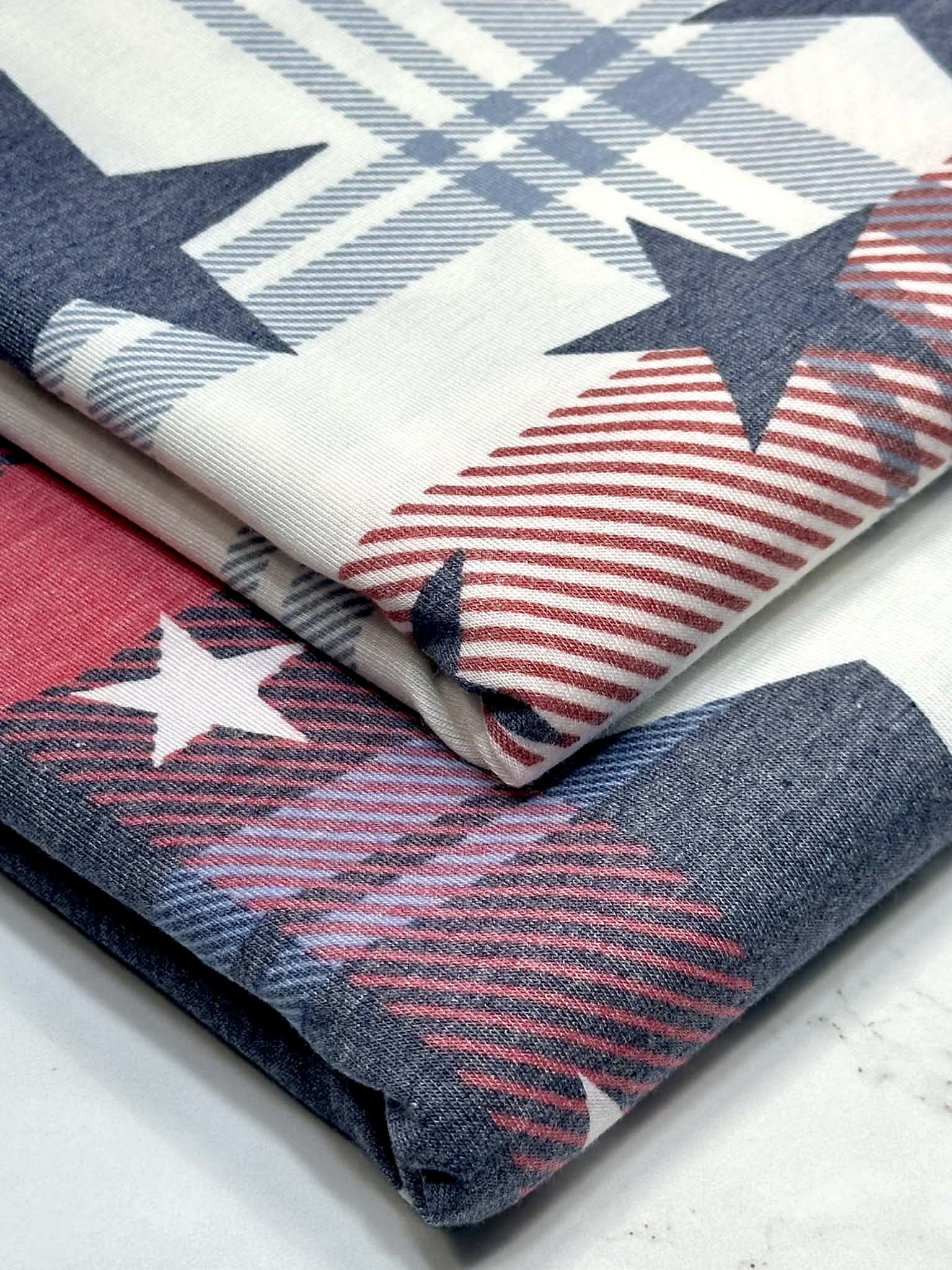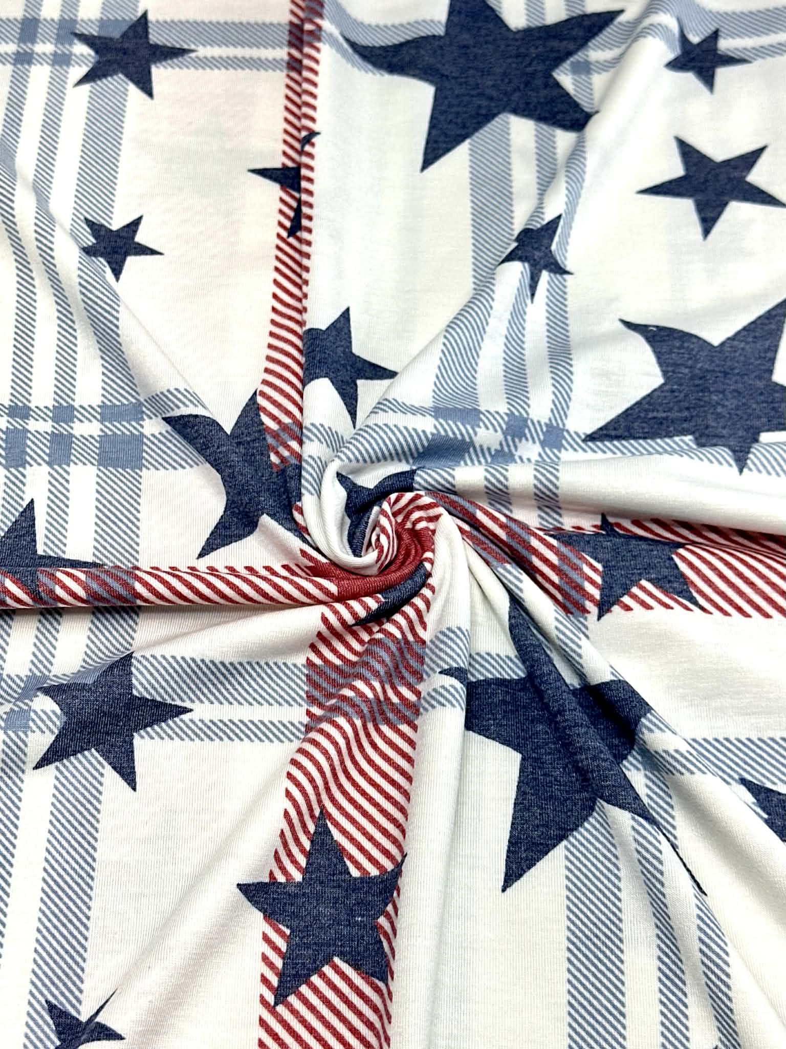 (KNIT) NAVY STARS ON RED, BLUE AND OFF WHITE PLAID