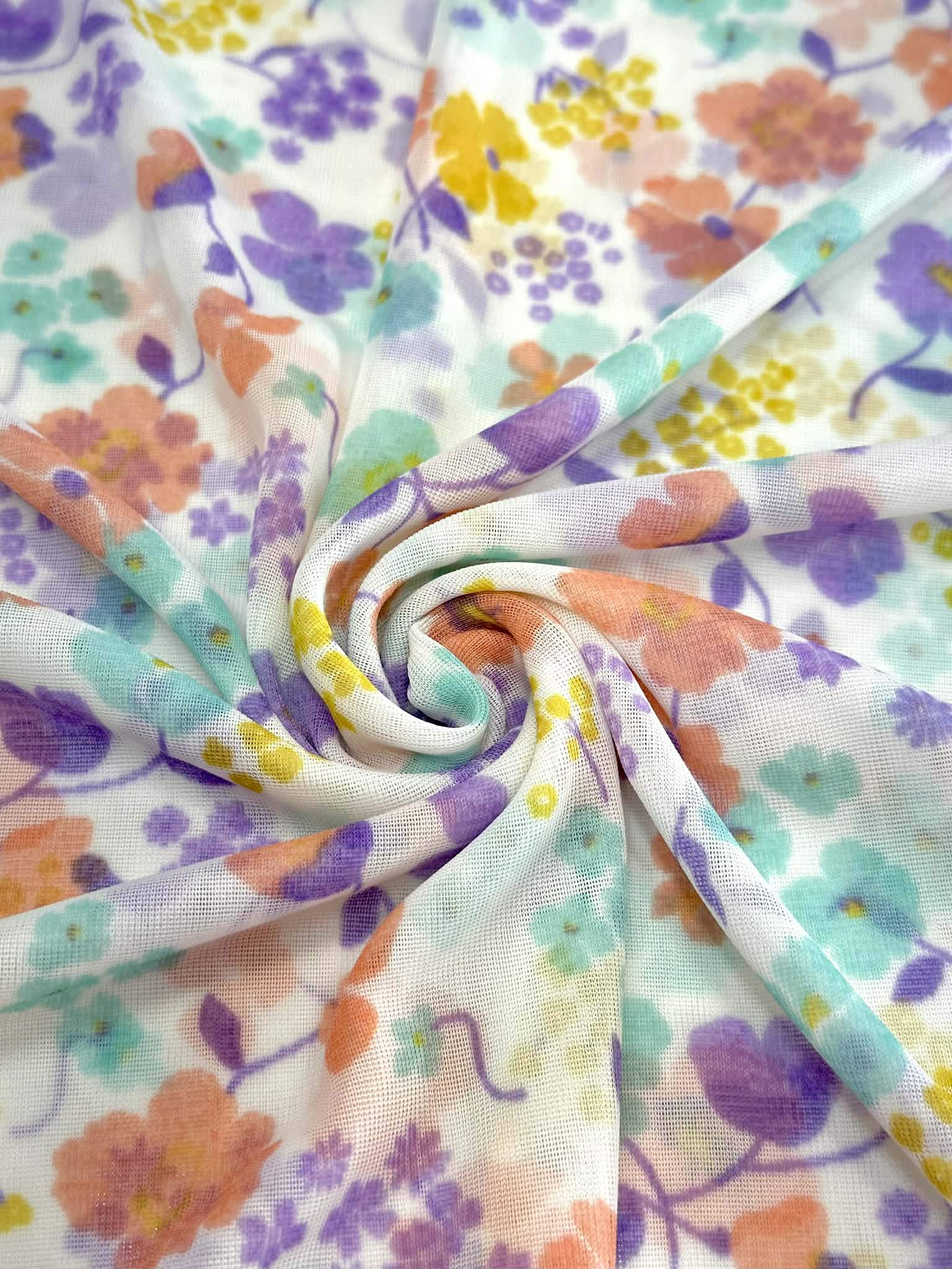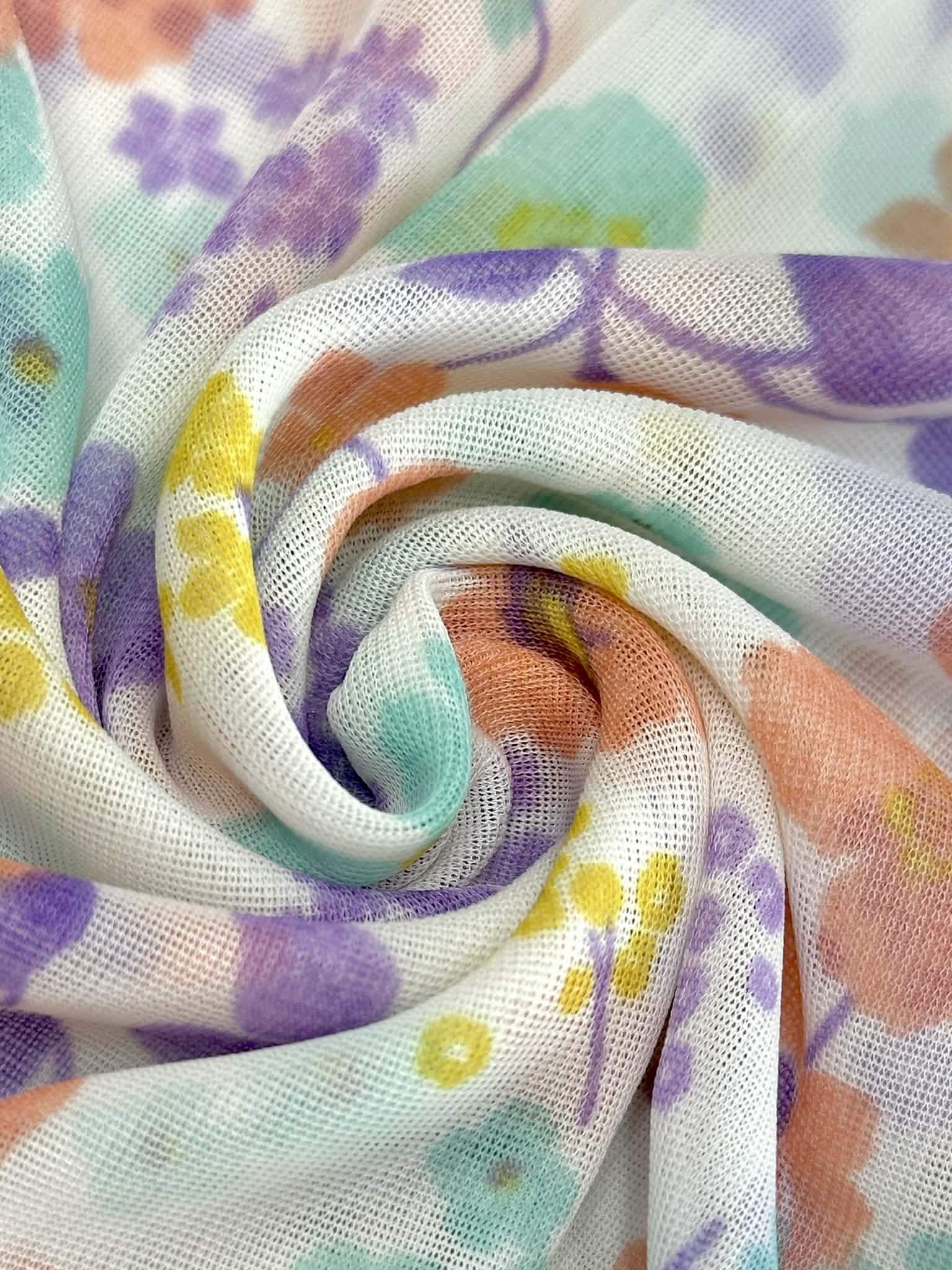 (MESH) MINT, LAVENDER , PEACH, AND YELLOW FLOWERS ON OFF WHITE