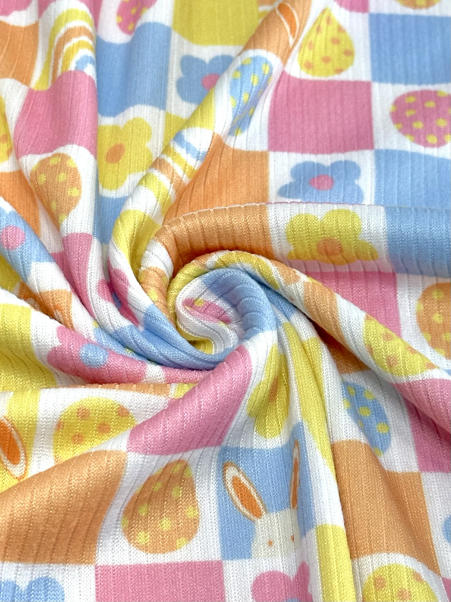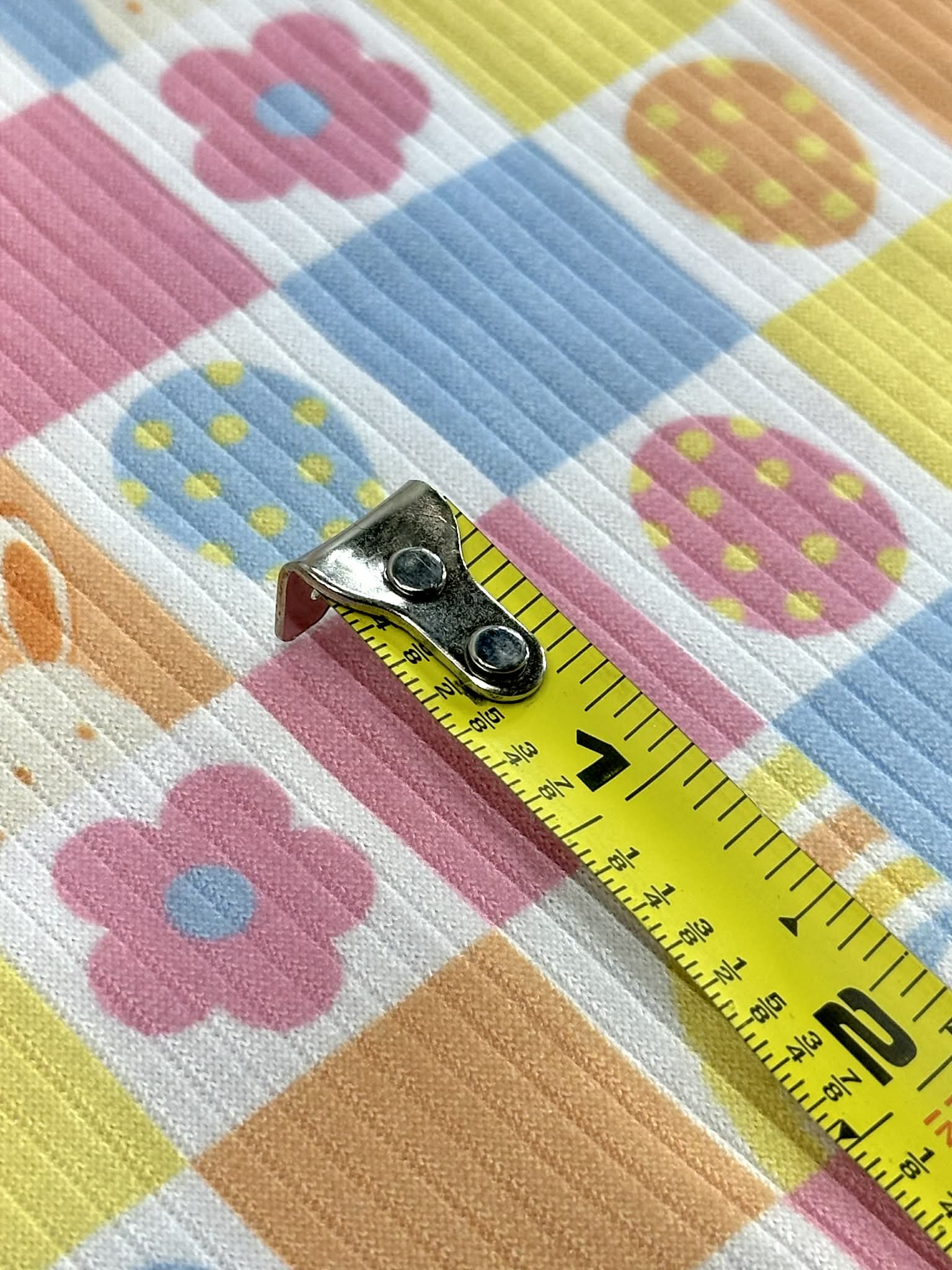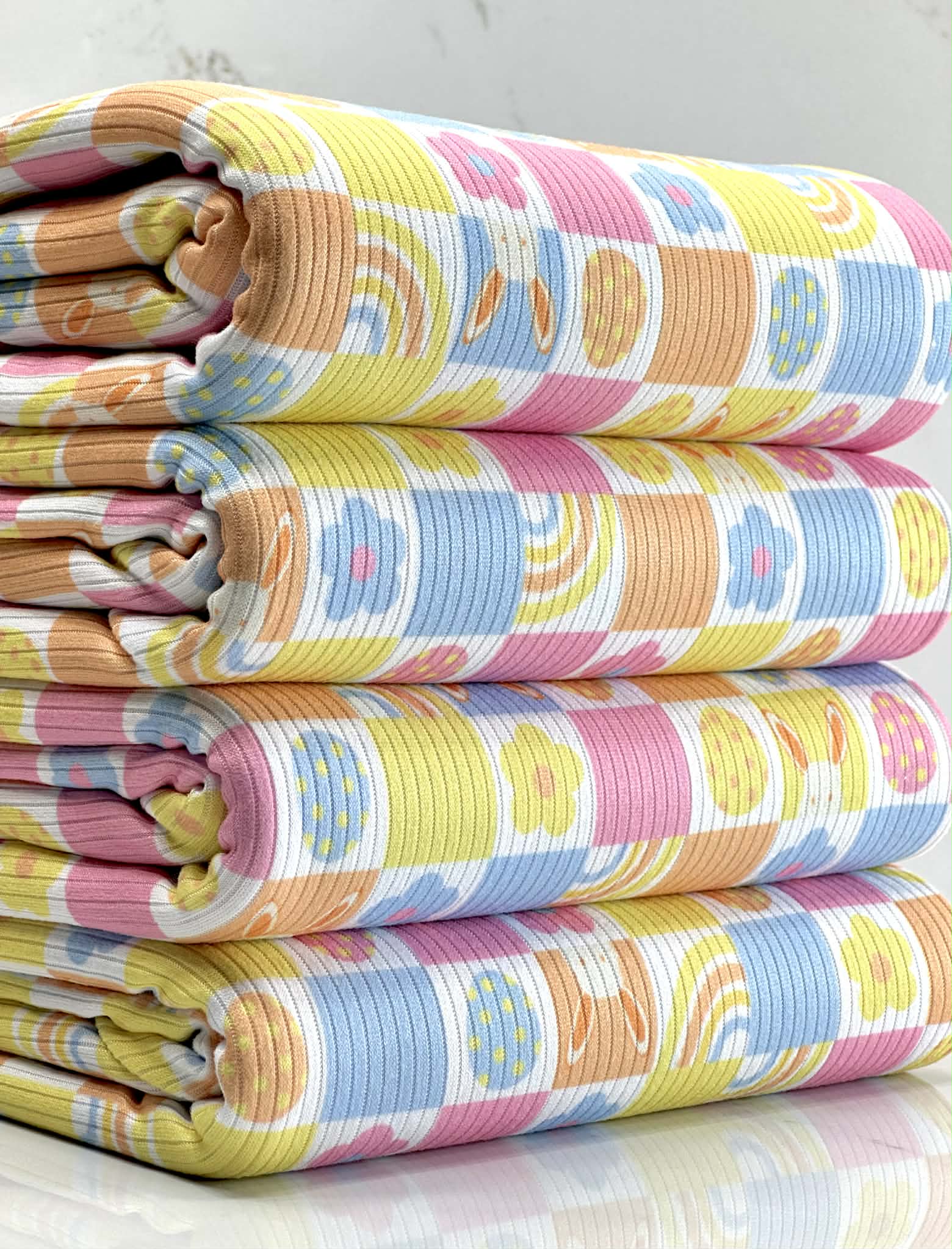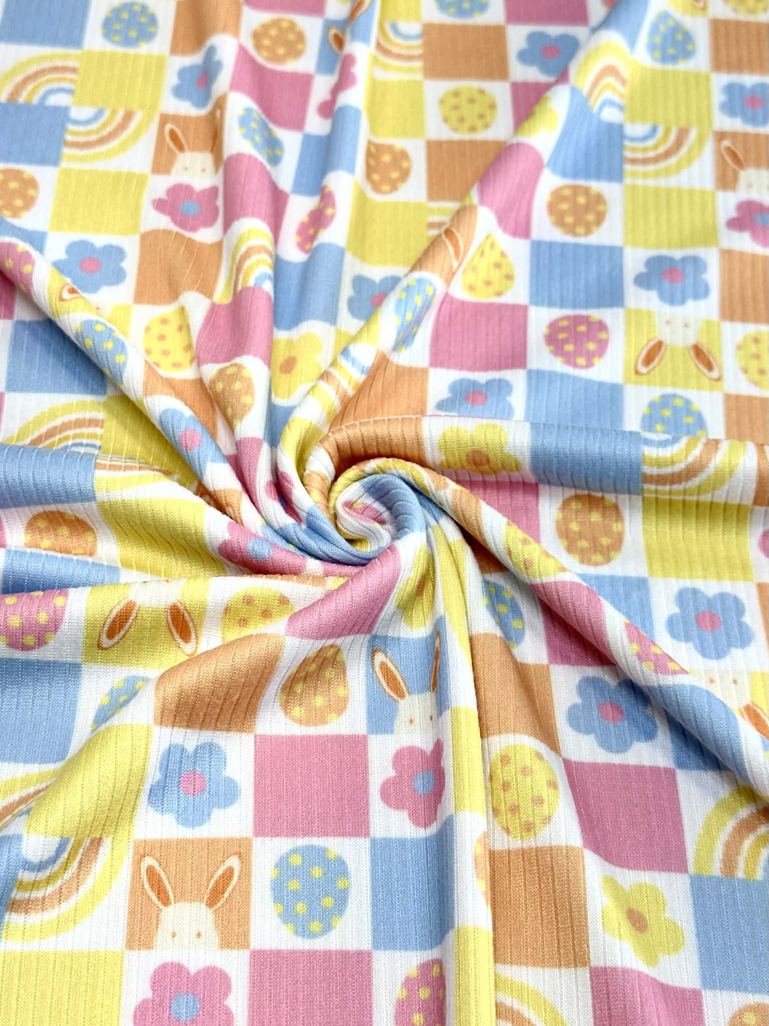 (4X2 YUMMY RIB) BUNNYS, EGGS, RAINBOWS, AND FLOWERS, CHECKERED PATTERN
