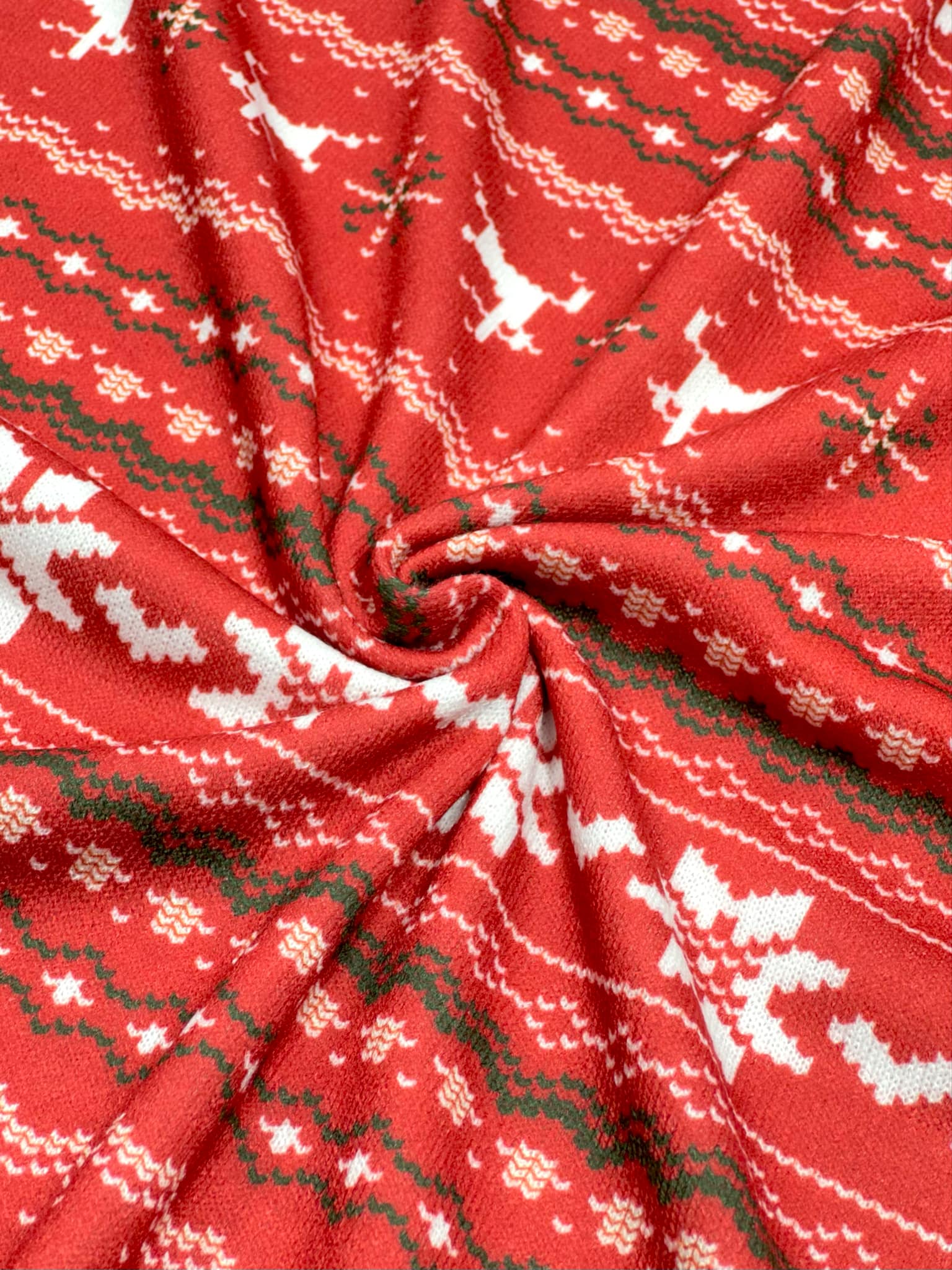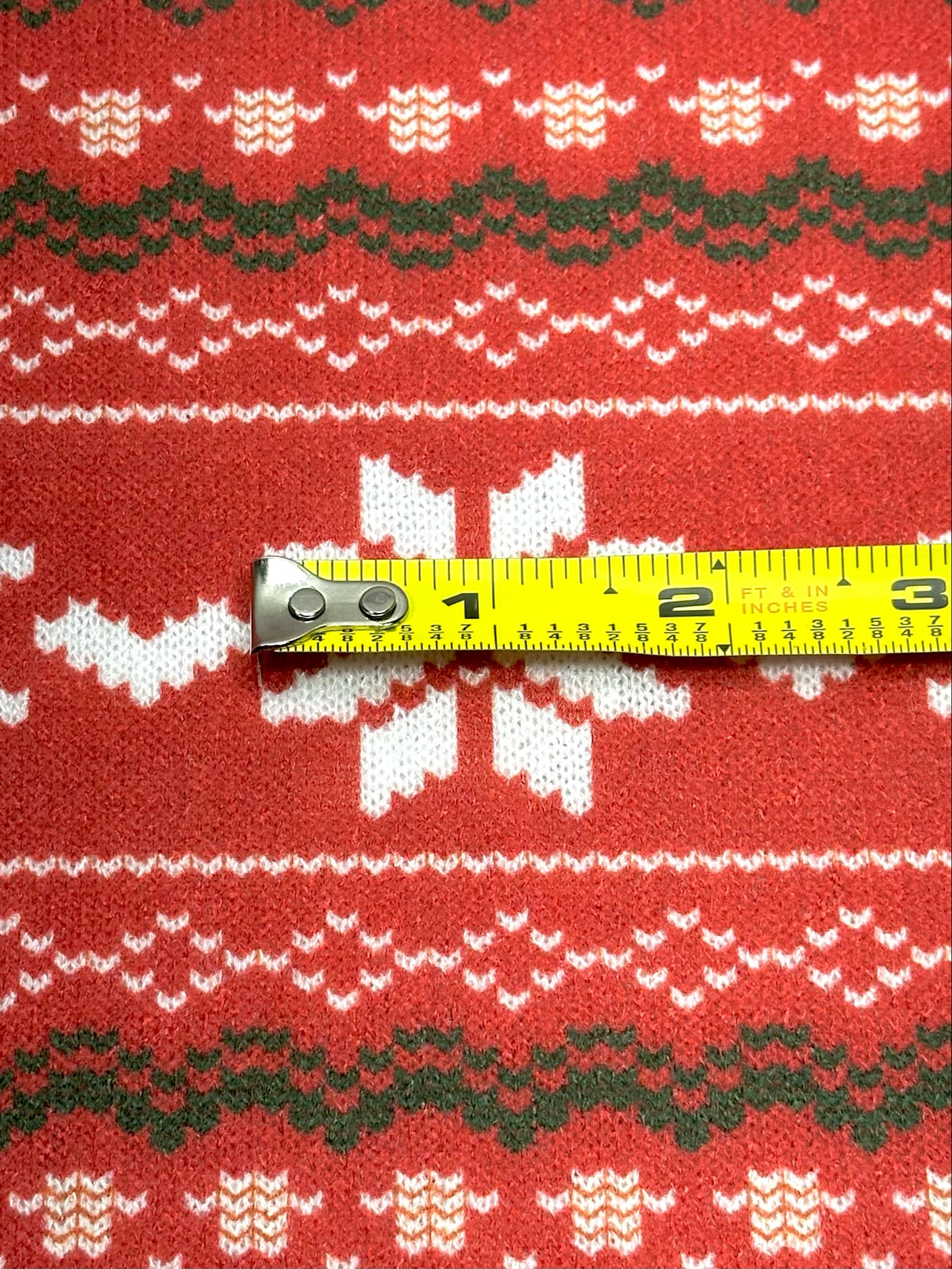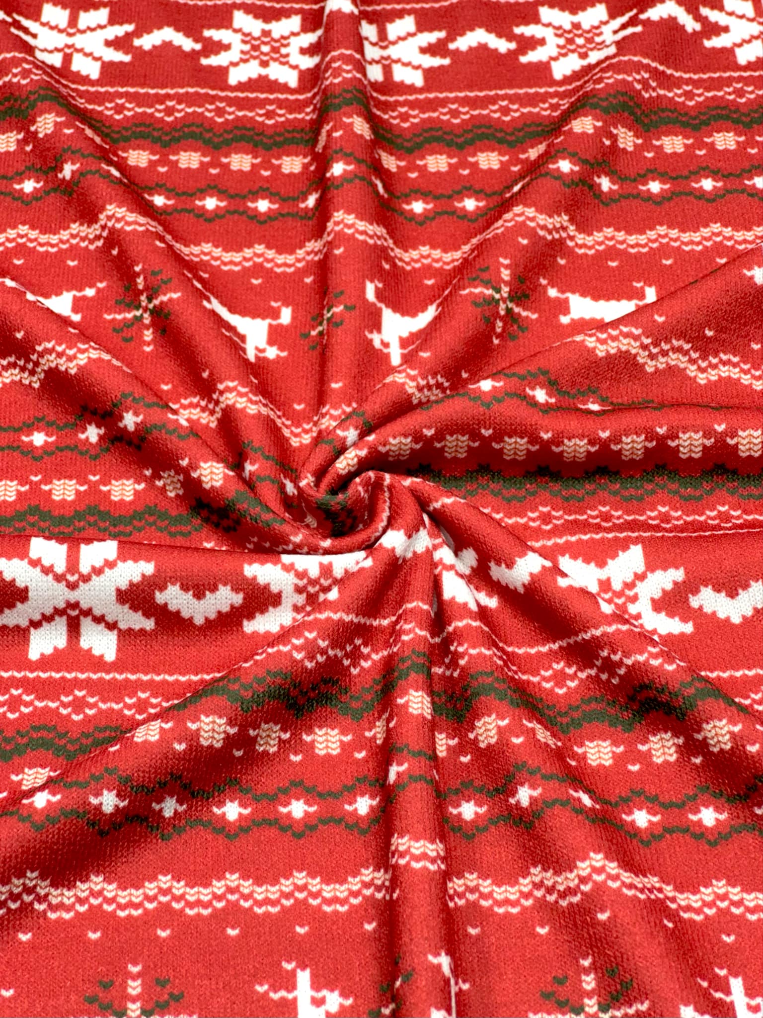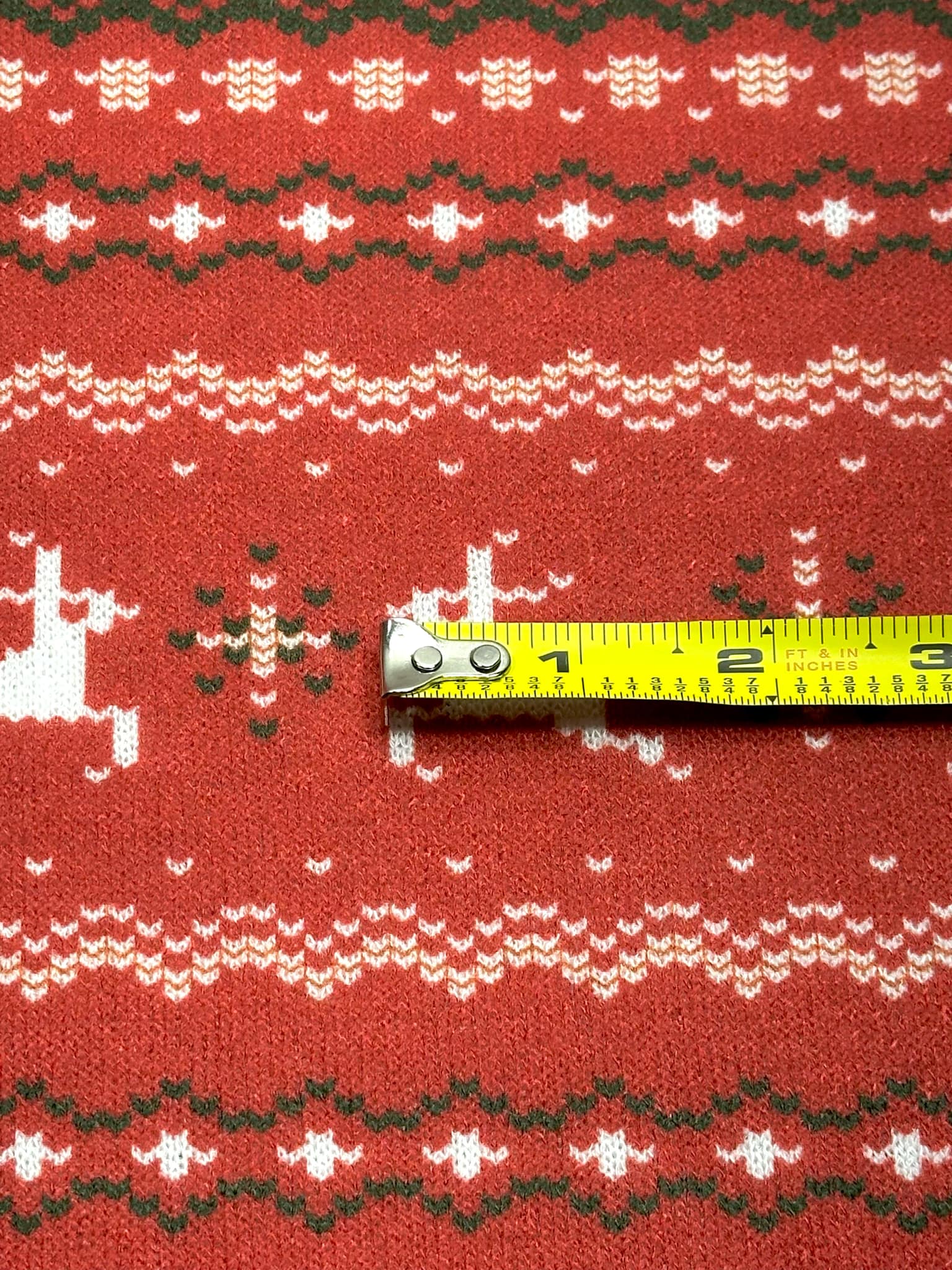 (SWEATER KNIT) OFF WHITE REINDEERS AND OFF WHITE POINSETTIA'S ON RED